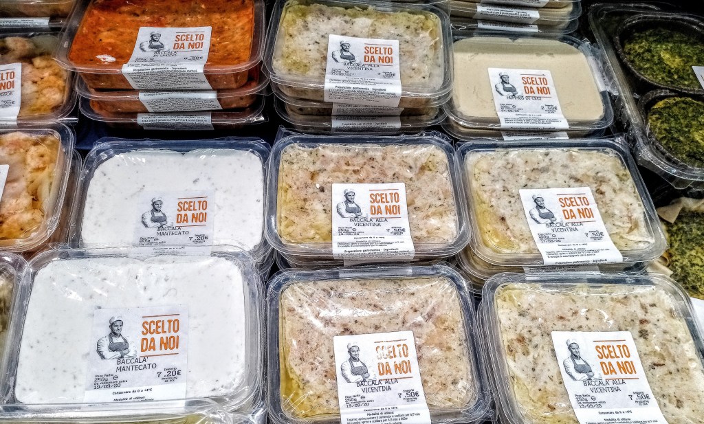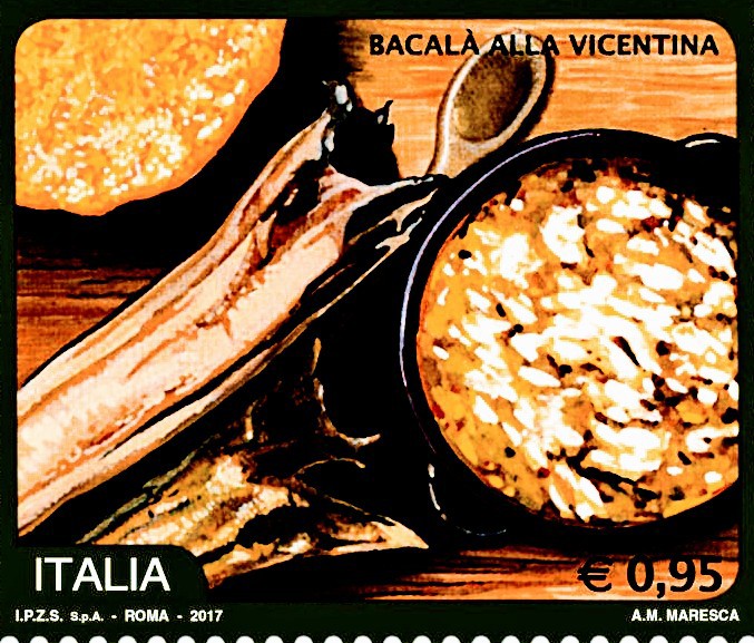 Baccalà e stoccafisso sono ormai la base di molti piatti della cucina italiana, diventati dei classici irrinunciabili sia nelle preparazioni casalinghe che in ricette proposte nei ristoranti e nei negozi di gastronomia. I piatti a base di baccalà e stoccafisso sono nel tempo diventati oggetto di dissertazioni accademiche e alcune associazioni ne difendono la purezza e il rigore della preparazione senza che ci si discosti dalla ricetta tradizionale. Nel 1987 è nata a Sandrigo in provincia di Vicenza, La Confraternita Del Bacalà Alla Vicentina, secondo i dettami della quale, questo piatto prima che sia pronto, deve pipare, cioè fare piccoli sbuffi durante una lenta cottura che non può essere di durata inferiore a quattro ore: il rigido stoccafisso accompagnato alla polenta, si trasforma così in una delizia per i nostri sensi. Come succede a Vicenza per il Bacalà alla Vicentina o a Napoli per il famoso Ragù, la lenta cottura è un rito, ci fa comprendere l’amore degli Italiani per il loro cibo che diventa cultura, opera d’arte in cucina, che si consuma e poi ancora una volta si rinnova ogniqualvolta venga preparata. Il Bacalà Alla Vicentina è un piatto entrato a pieno diritto nella tradizione culinaria italiana, tanto da venir celebrato anche in un francobollo che sapientemente lo illustra.