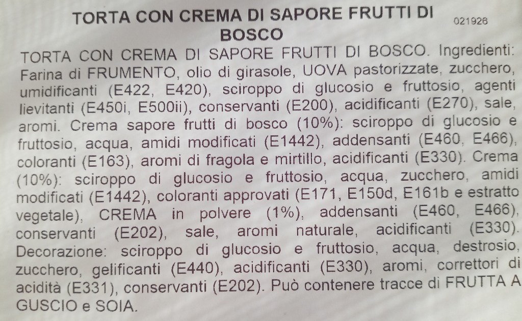 Secondo voi può esistere un prodotto dolciario, addirittura una torta, che si chiama Torta con crema di sapore di frutti di bosco? Certamente sì, dal momento che non è l’unico prodotto industriale che riproduce con vari metodi un sapore, un ingrediente, un aroma senza che nessuno di questi ultimi siano minimamente presenti all’interno di quello che si può mangiare oppure bere.